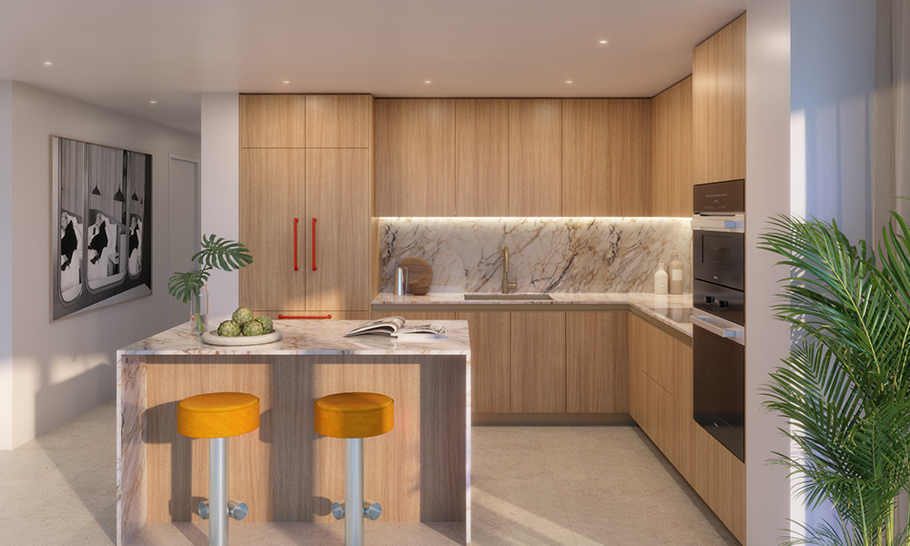 Las cocinas incluyen gabinetes italianos Italkraft, refrigeradores con paneles integrados, lavavajillas silencioso, estufa de vitrocerámica y un fregadero de acero inoxidable de gran tamaño. Los baños cuentan con sofisticados gabinetes Italkraft, y en unidades seleccionadas, los dormitorios principales ofrecen amplios vestidores.